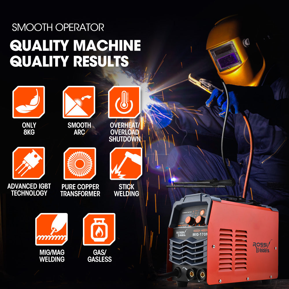 The Rossi MIG-170N - powerful, yet extremely lightweight 170Amp MIG/Stick iGBT inverter welder is a must have for any handyman or serious DIYer. Highly compact and featuring true iGBT DC inverter technology, you’re assured an instant start and deep penetration.