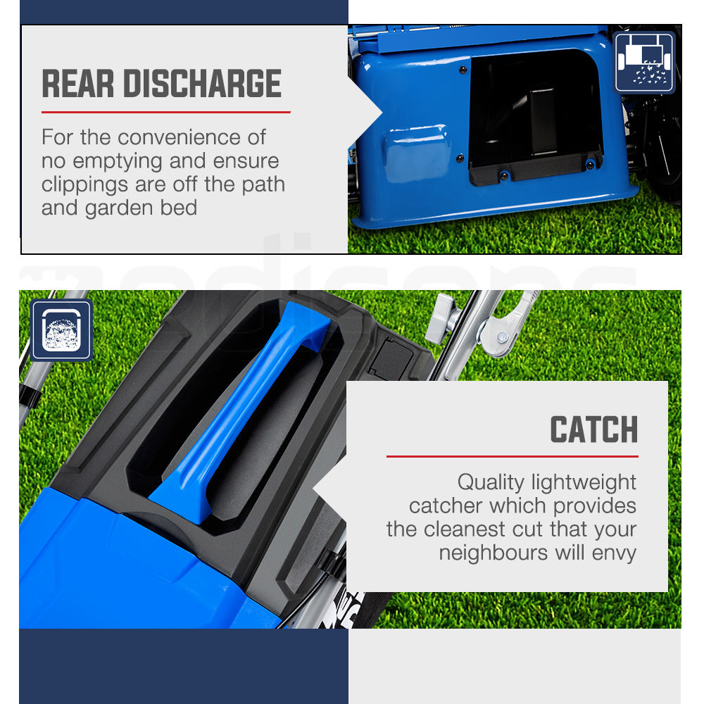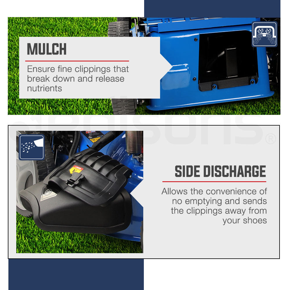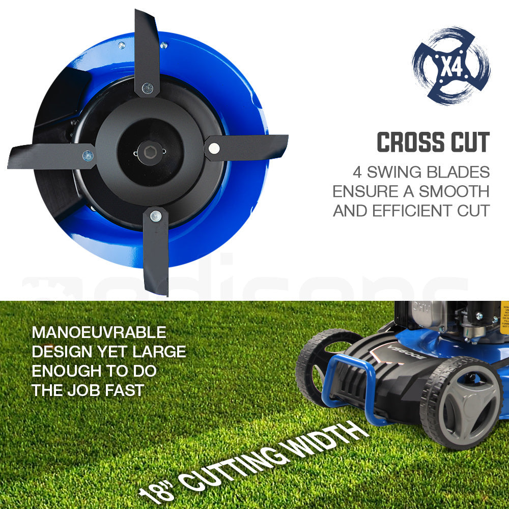 Absolute world class quality is complemented by all the features you need; integrated drink holders, steel bumper bar and quick release folding handles. 4-in-1 functionality offers the option of catching, mulching, direct side discharge or direct rear discharge, while the oversized wheels and self-propelled design ensures mowing is a leisurely stroll. And with CrossCut swing blades you'll always end with a perfectly cut lawn that your neighbours will envy!