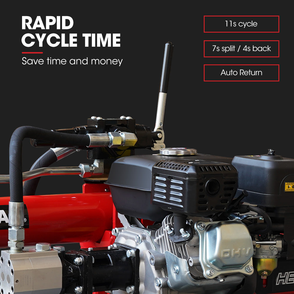 The Baumr-AG Hercules Series HPS600 MkII Log Splitter means serious business. The advanced 212cc 8HP OHV petrol engine combined with a large 2-Stage gear pump works in harmony to offer 20 tonnes of splitting force on tap–making it the most powerful model of its size on the market! The Hercules series is manufactured in a world-class facility, ensuring the serious power is equaled by superb reliability. With a hardcore thick gauge steel frame and big all-terrain tyres, the HPS600 is right at home in Australian conditions–rupturing Gum and Ironbark logs with ease!