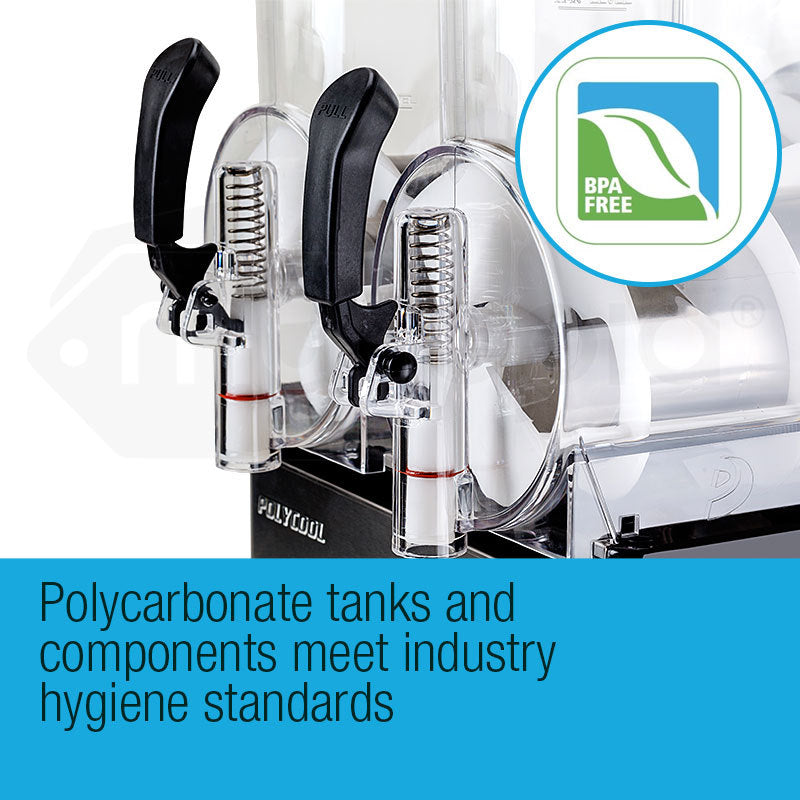 The Polycool features dual beaters, ensuring a hassle-free slushy-making experience with no ice blockages. Shock resistant and constructed from BPA-Free polycarbonate, its tanks meet all industry hygiene standards.