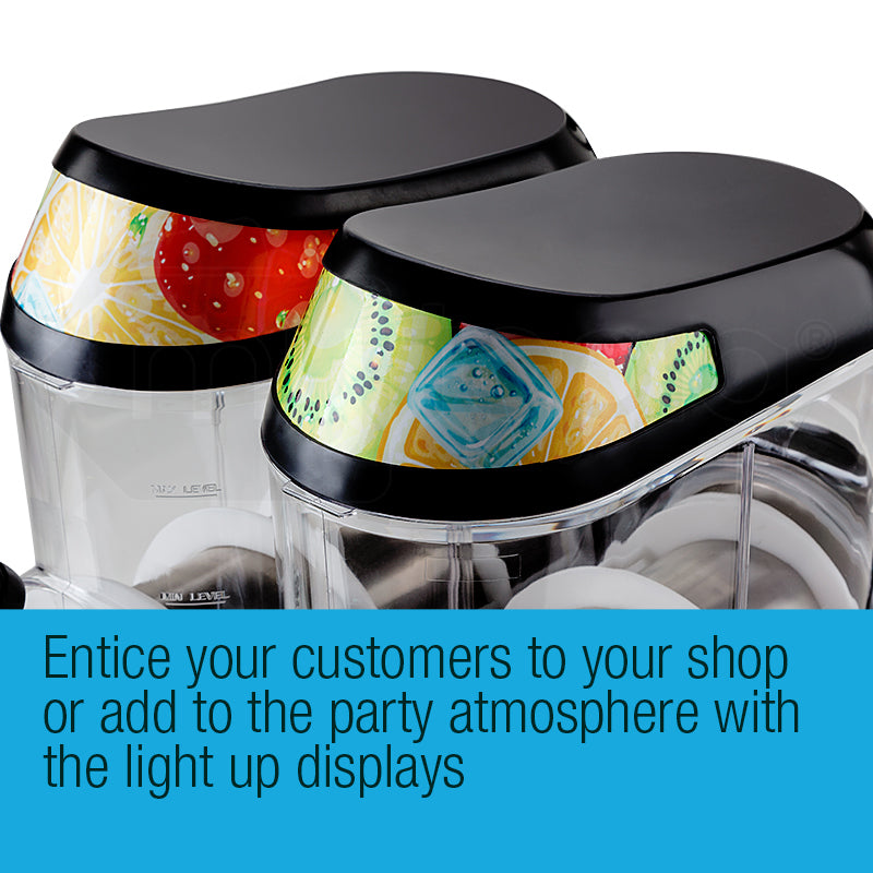 Create a steady stream of slushies, juices, frozen cocktails, iced coffee, and frappes, and witness your profits soar. The sleek commercial-grade stainless steel design of the PolyCool Commercial Slushie Maker seamlessly complements any shop decor, while only taking up a small footprint on your counter. Enticing back-lit containers and displays will tantalise your customers' cravings.