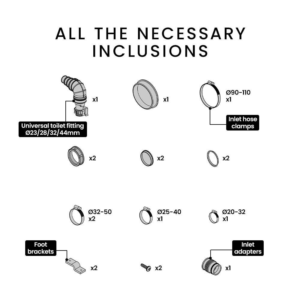 - 1 x Universal toilet inlet hose fitting and ⌀90-100mm hose clamp