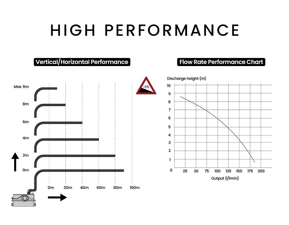 The Washlink 4 Commercial runs smoothly, thanks to its powerful 800W copper wound motor and rubber feet. Specially moulded non-clog stainless-steel impeller blades make short work of all waste, and can even cut through materials such as condoms, paper towels, and female sanitary products. It is capable of pumping up to nine metres vertically and 90 metres horizontally.