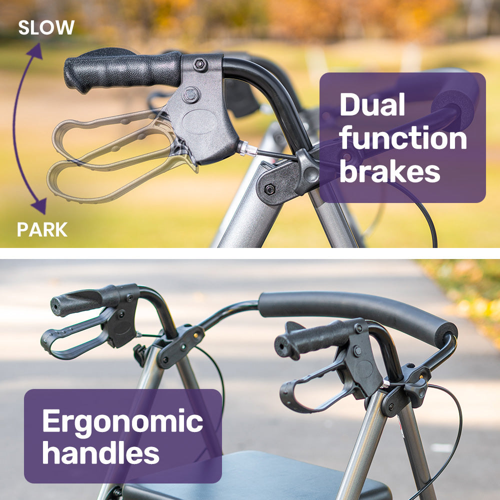With dual-action braking and parking handbrakes, adjustable handle height, ridged grips, padded seating and a padded contoured backrest, your Equipmed rollator offers great ergonomics and comfort.