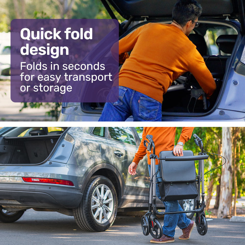 This high quality Equipmed rollator is easily foldable for practical storage and transport.