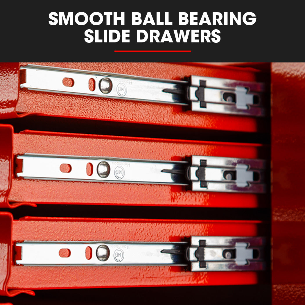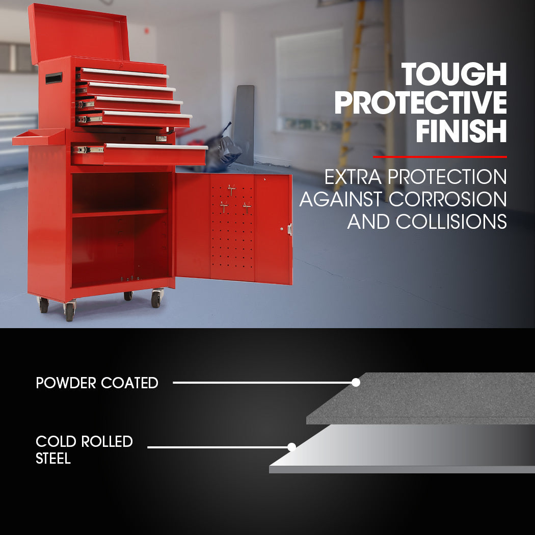 Both the cabinet and chest are built with high tensile powder coated steel enclosures. Equipped with an EVA mat, each drawer slides effortlessly in and out on smooth ball bearing rails, which makes finding and accessing each tool a cinch. The cabinet also comes with 3 pegs and the chest is easily transportable thanks to its side carry handles.