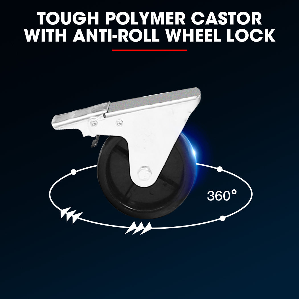 The Bullet 5 Drawer storage trolley comes with an upper chest where valuable or often 'borrowed' items can be stored. The drawers have varying depths and sizes to accommodate all types of equipment and parts. The lower cabinet features a self-contained door that stays open and out of the way for easy access to its contents. This space is large enough to keep a range of bulkier items. The cabinet sits on top of four caster wheels with 2 x caster locks, so you have the option to secure it in one place or move it with you around a workspace. This compact double unit fits discreetly in even the smallest spaces or storage areas.