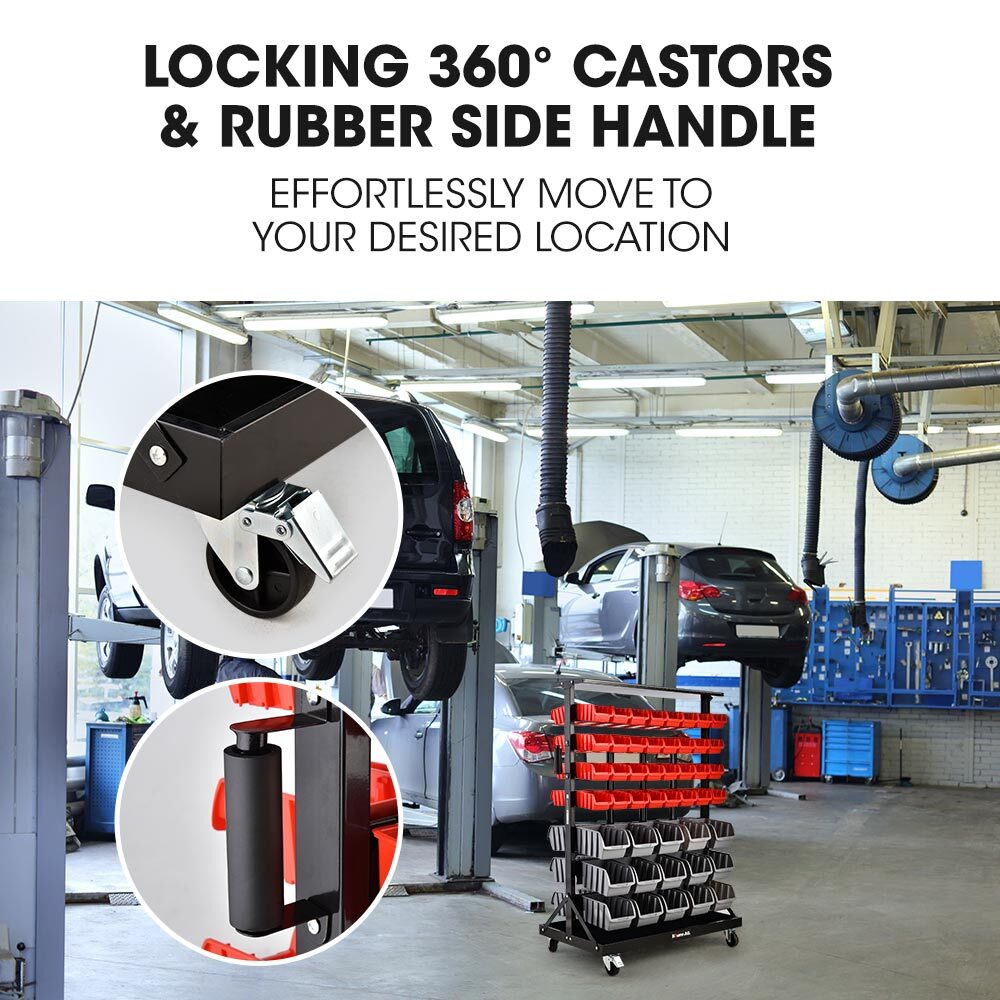 The tough injection moulded polypropylene tubs come in two sizes and are easy to remove and place back on the rails. Slots on the front of the tubs give you the option of labelling your parts and hardware. Locking 360° castors and a rubber side handle allow you to effortlessly move the rack to your desired location.