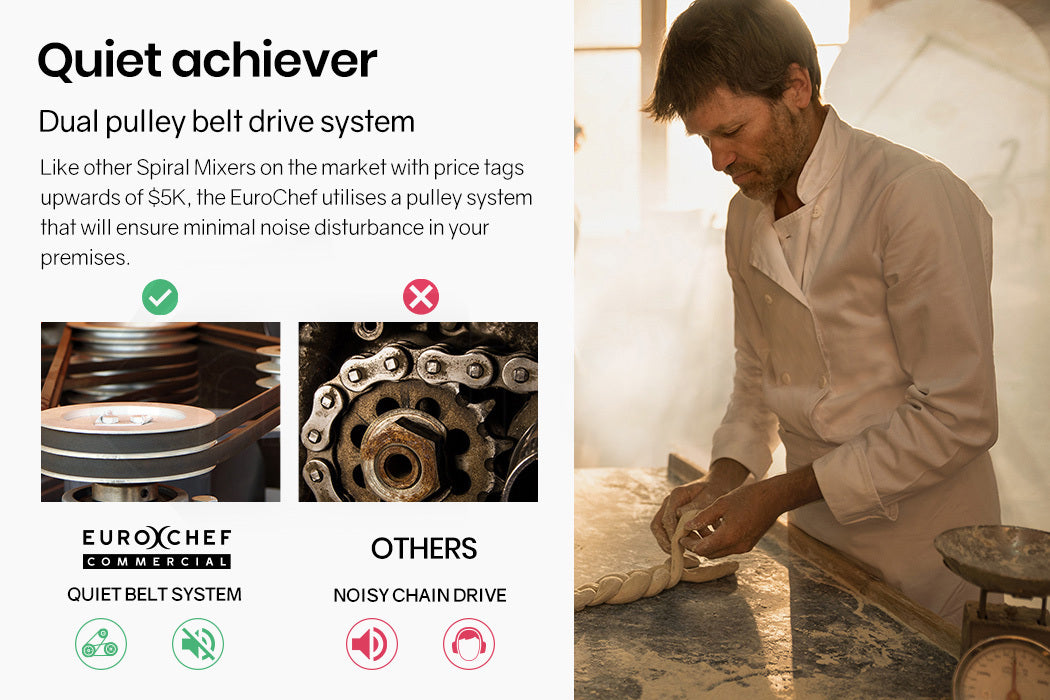 Construction of this 10L model is heavy-duty throughout, as attested to by the mixer’s substantial 60kg weight. Unlike inferior models that employ a noisy chain drive system the Eurochef Commercial range features a high torque dual-belt drive system. A timer allows you to program and set appropriate mixing times for various products. Built-in safety features include emergency stop and bowl guard switch.