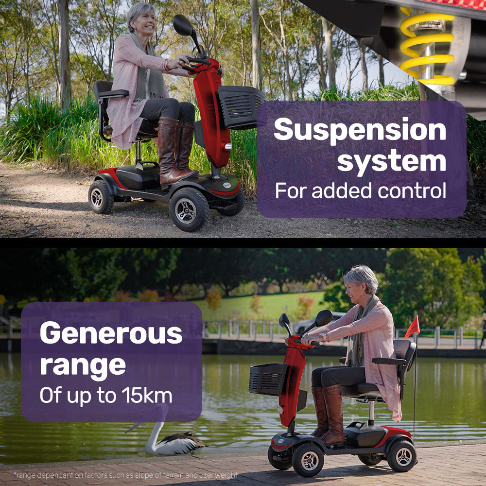 Regain independence the Pathline Series Mobility Scooter from Equipmed. The controls are simple and intuitive for anyone to become familiar with, and rear suspension ensures a smooth ride. It has a sensible speed of up to 8km/h, a generous range of 15-25km and a battery level meter on the dash.