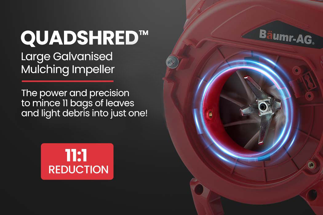 The QuadShred™galvanised impeller mulches leaves and light foliage so finely that you can fit 11 times as much into the large 50L shoulder strap bag! Plus, emptying the bag takes no time thanks to the full length zipper.