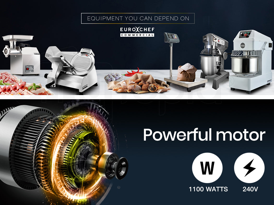 The bowl, wire whisk, spiral dough hook and flat beater can each be conveniently attached and removed easily in seconds. These stainless steel attachments along with the bowl exceed food industry standards worldwide. A full metal body design offers both stability and effortless cleaning, while the protective guard provides peace of mind. The EuroChef Commercial range is offered direct to the public at wholesale prices, making this stand mixer a smart investment for savvy owners of bakeries, restaurants, pizzerias and school canteens.