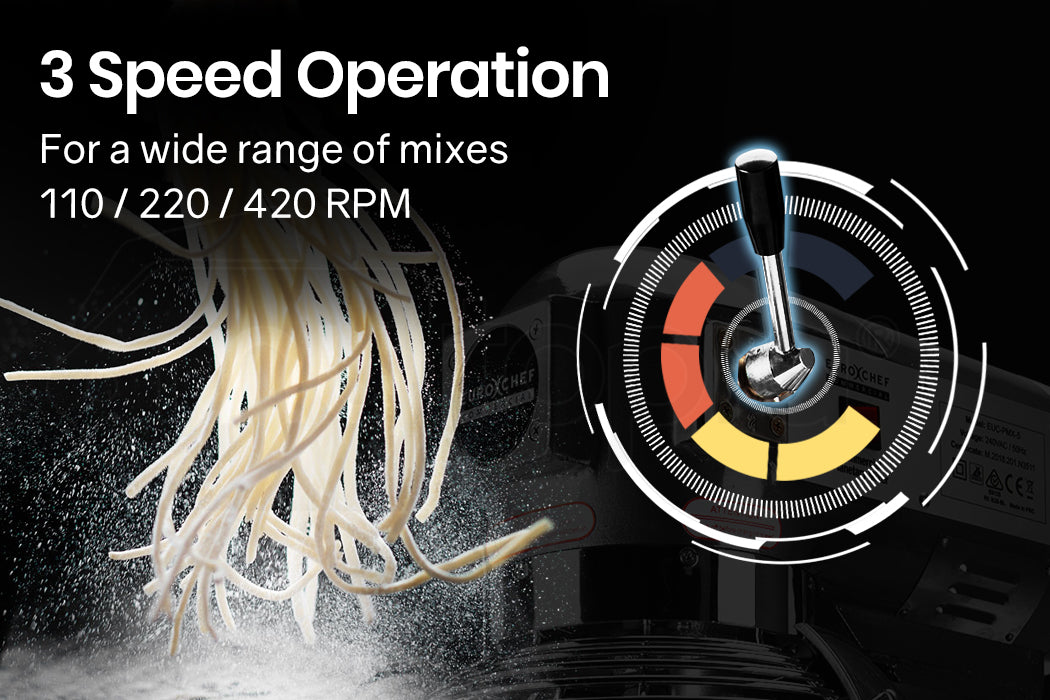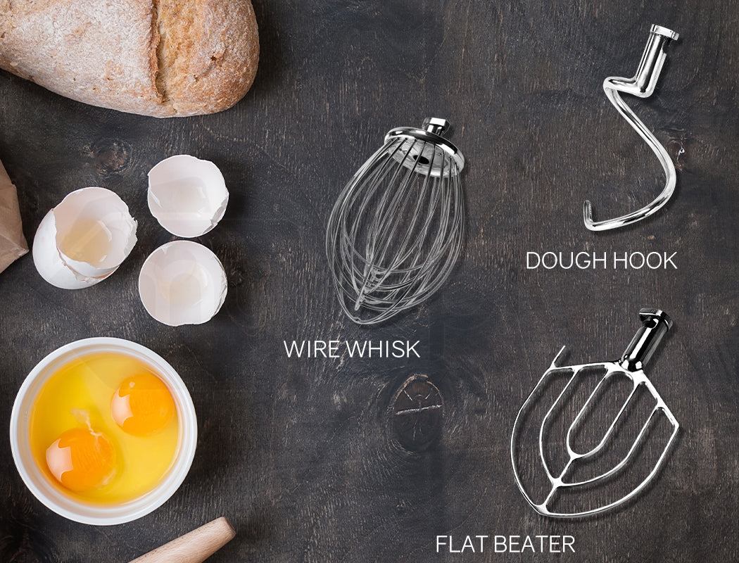 - 3 easy switch attachments: wire whisk, spiral dough hook, flat beater