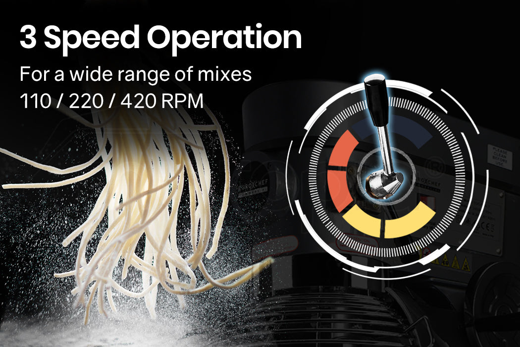 Introducing the 30L Planetary Food Mixer from the EuroChef Commercial range. This model is meticulously designed to deliver high quality mixing results for large batch food recipes, with its powerful 1200W copper wound motor and hardened 3-speed direct drive transmission. This large model is designed to be positioned on the floor, and efficient output is assured with a large 30L capacity allowing for mixing of everything from doughs, icings and sauces, to mashing of vegetables.