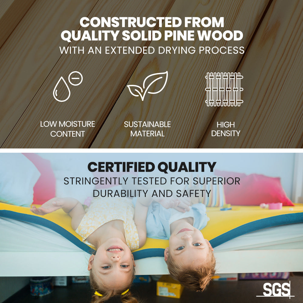 This Kingston Slumber Bed Frame Bunk Bed is crafted from solid high-quality sustainably sourced timber and is compatible with standard Australian single sized mattresses. Safety is paramount with SGS-certified quality, rigorously tested for superior durability. The bed features durable plywood slats, an extra-reinforced frame, and a solid, secure ladder.