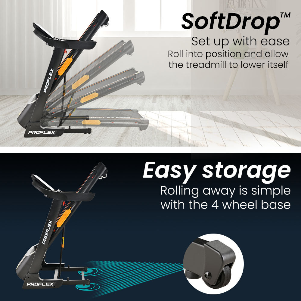 Enjoy your favourite music by plugging in your smartphone or connecting via Bluetooth, powering your session through built-in speakers. The SmoothStride 8-point suspension system cushions every step, while dual transport wheels and the hydraulic SoftDrop folding deck make setup and storage effortless.