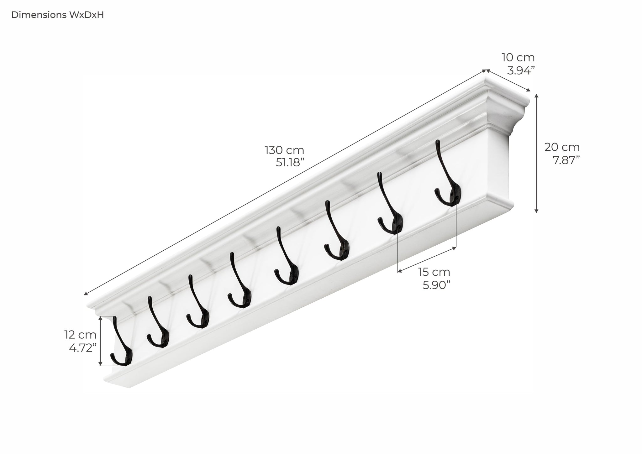 Add some flair with this cleverly designed coat rack. A small shelf has been incorporated into the crown molding, as a spot to display your decorative wares. Large coat hooks, with an antique brass finish, provide a home for coats, keys, or handbags. Select either 2, 4, 6 or 8 hook formation.