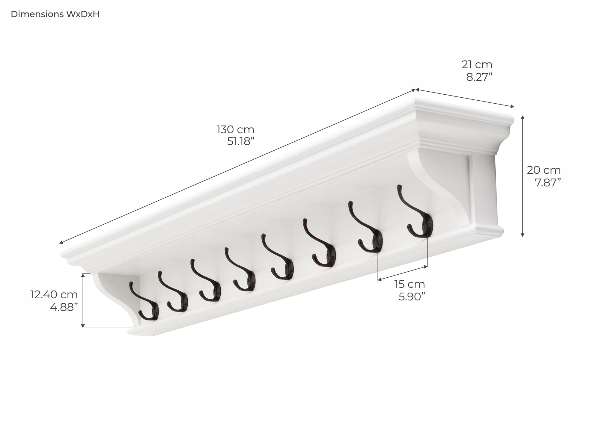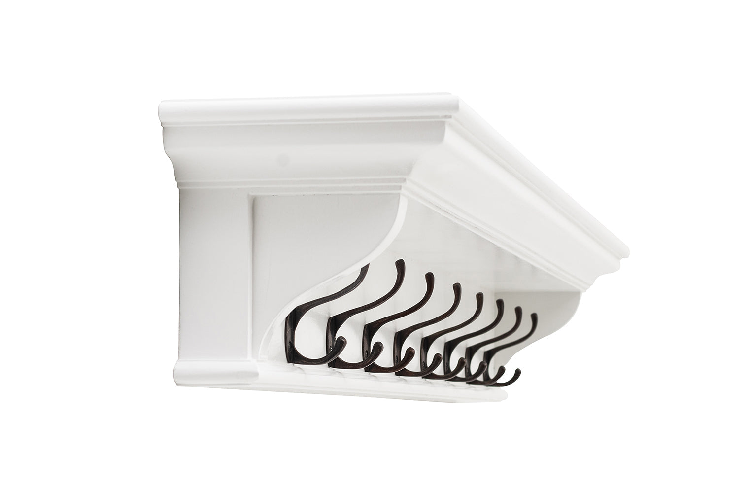 Add some flair with this cleverly designed coat rack. A small shelf has been incorporated into the crown molding, as a spot to display your decorative wares. Large coat hooks, with an antique brass finish, provide a home for coats, keys, or handbags. Select either 4, 6 or 8 hook formation.