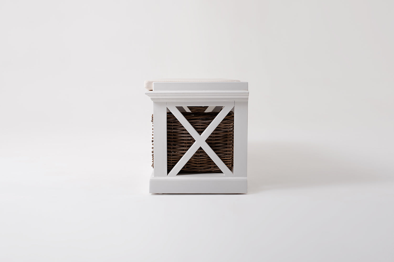 Low profile combination bench and storage unit offers appealing storage options, with its smart combination of hand-woven kubut rattan baskets and shelving. And, when needed, extra seating can be provided in a pinches. The flared crown molding, rustic baskets, and painted finish, all work in unison, to create this unique piece.
