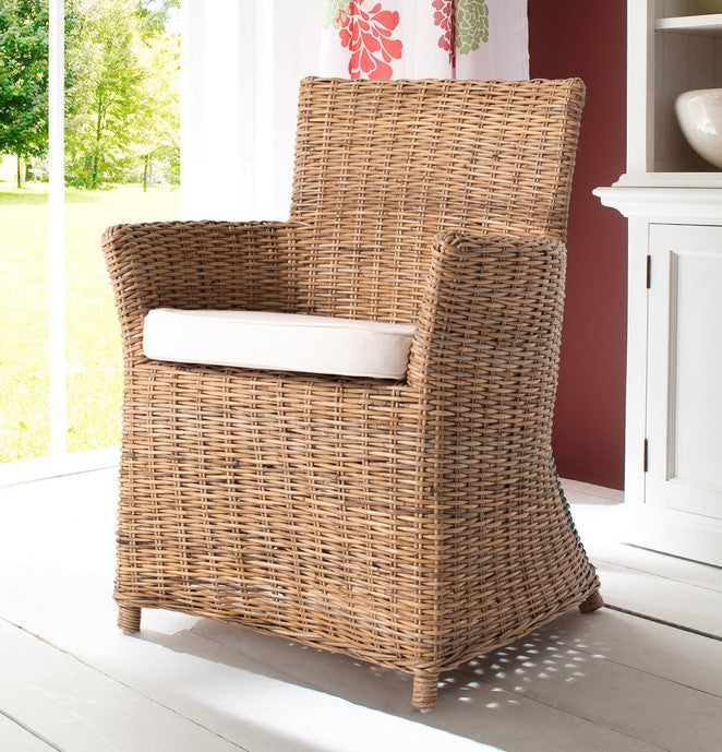 The unique rounded lines of the Bishop Chair, in hand woven rattan, provide not only a strong visual statement, but are designed with comfort in mind. The included cushion echoes the shape. Cushion cover, fabricated in 100 % cotton herringbone, is removable for ease of cleaning.