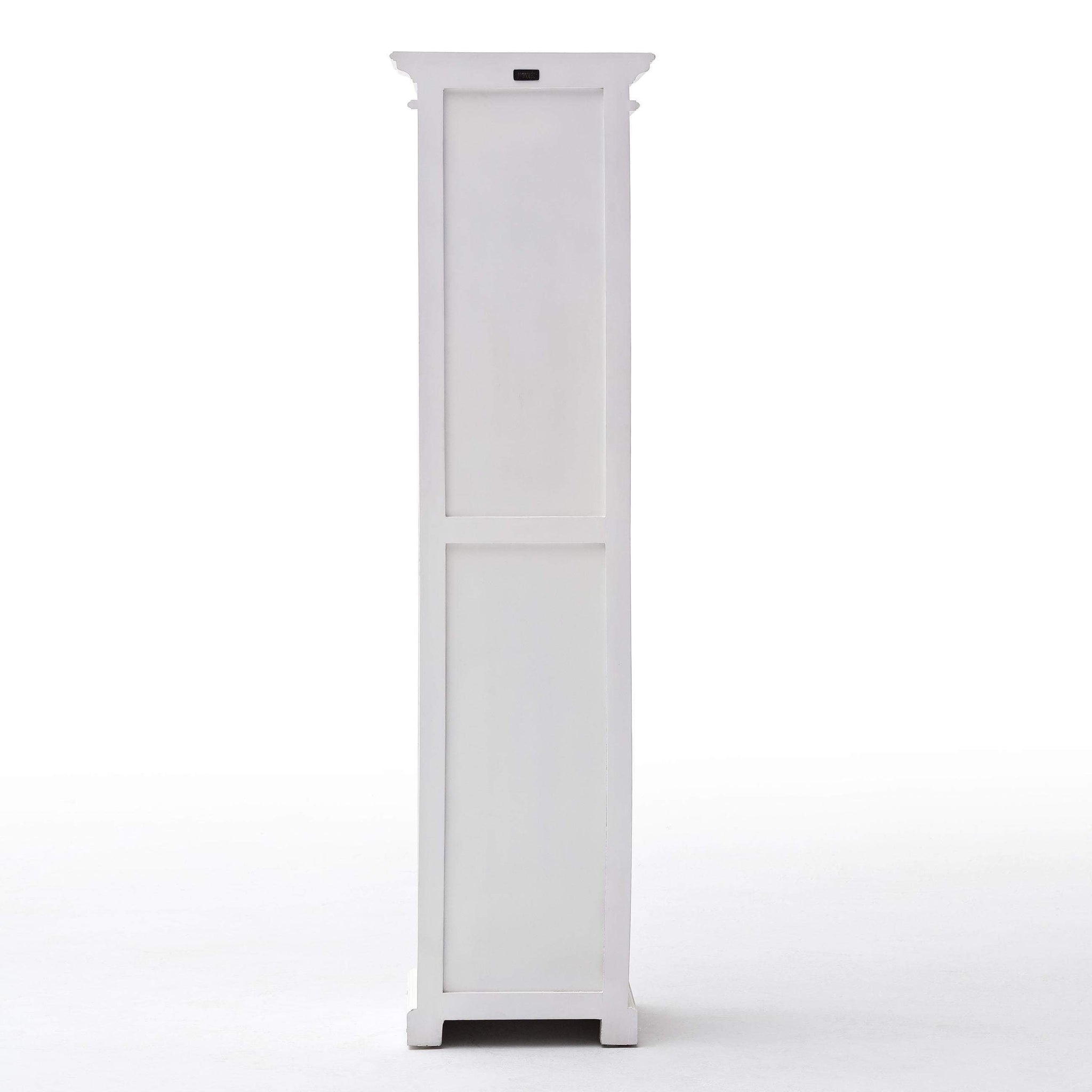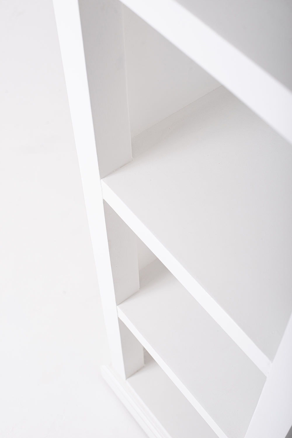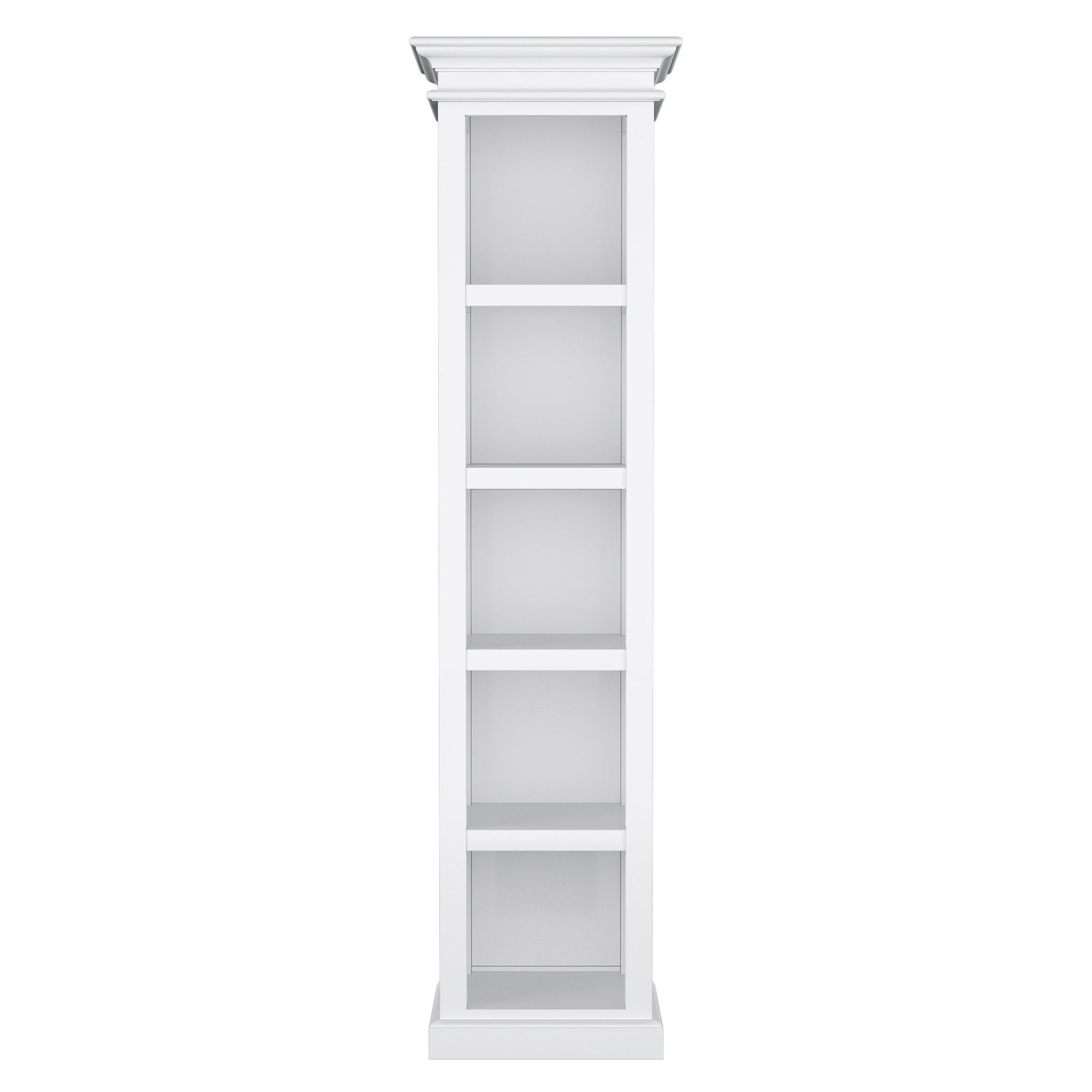 Detailed wooden molding tops a columnar bookshelf with fixed shelving. Display not just books, but collectibles as well. This is a perfect for compact spaces.