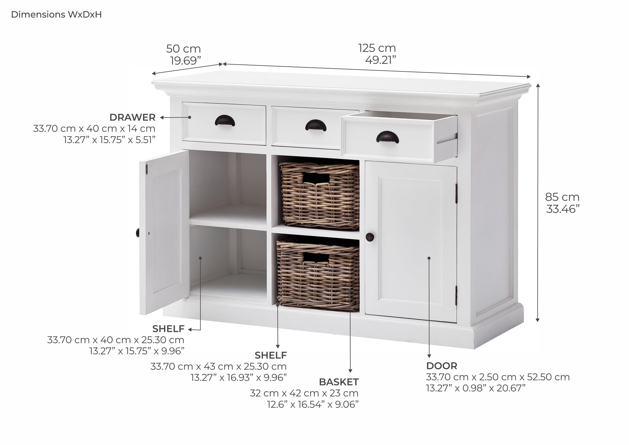 This variation on our classic buffet offers clever storage versitality with its combination of generous drawers, hand-woven baskets and fixed shelving behind shaker style doors. It's the ideal piece for the living or dining room, housing linens, housewares, or wine glasses