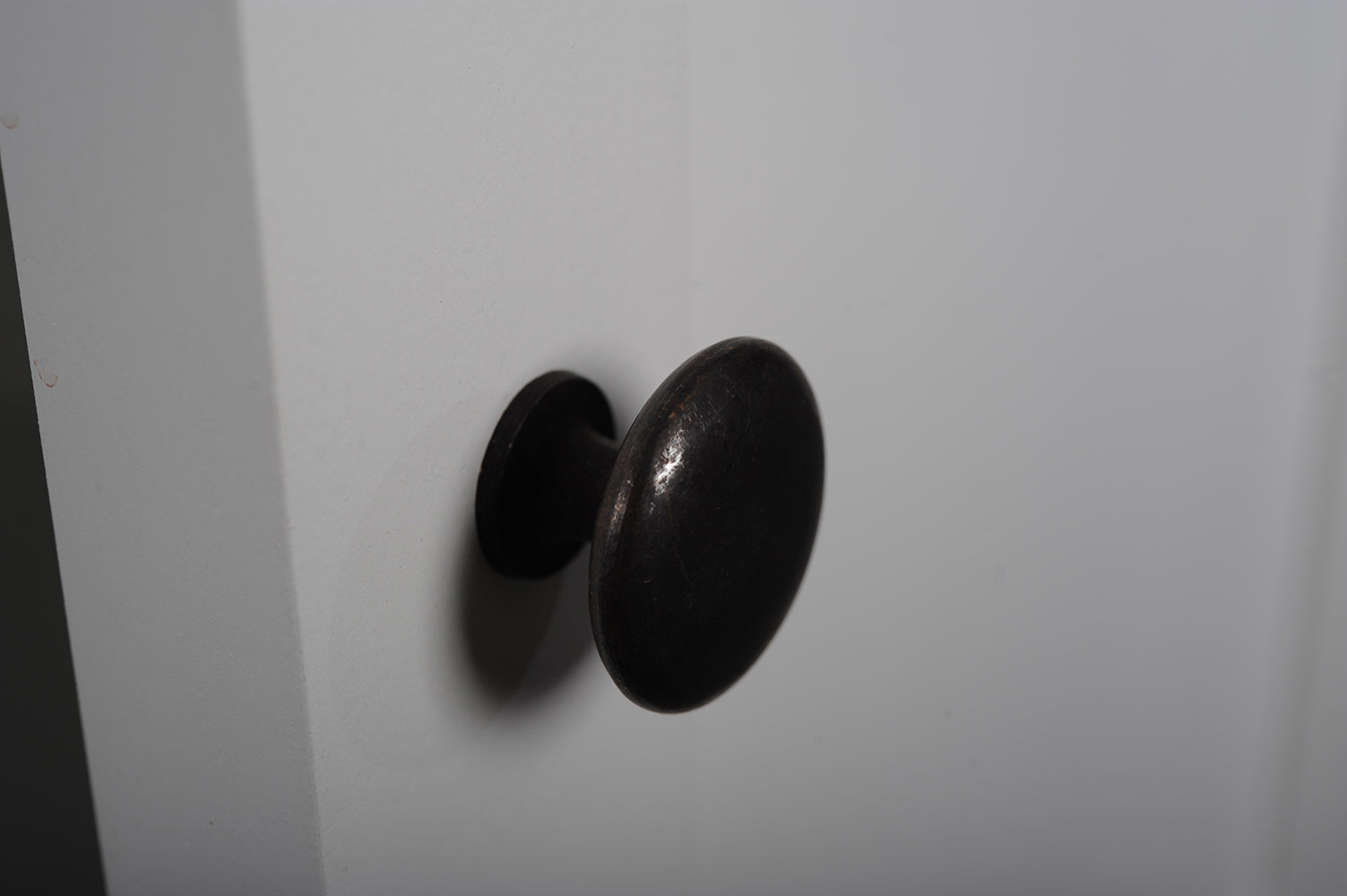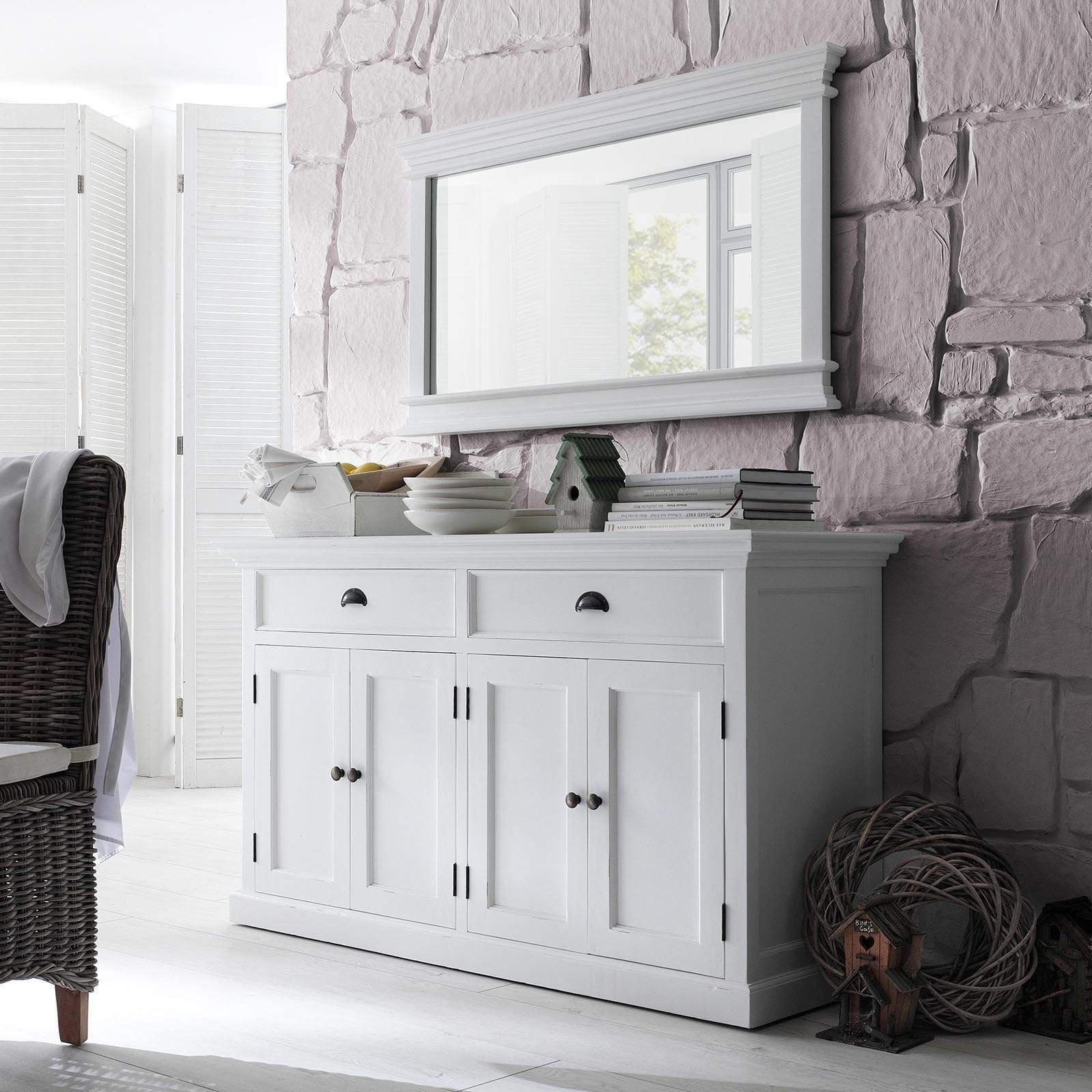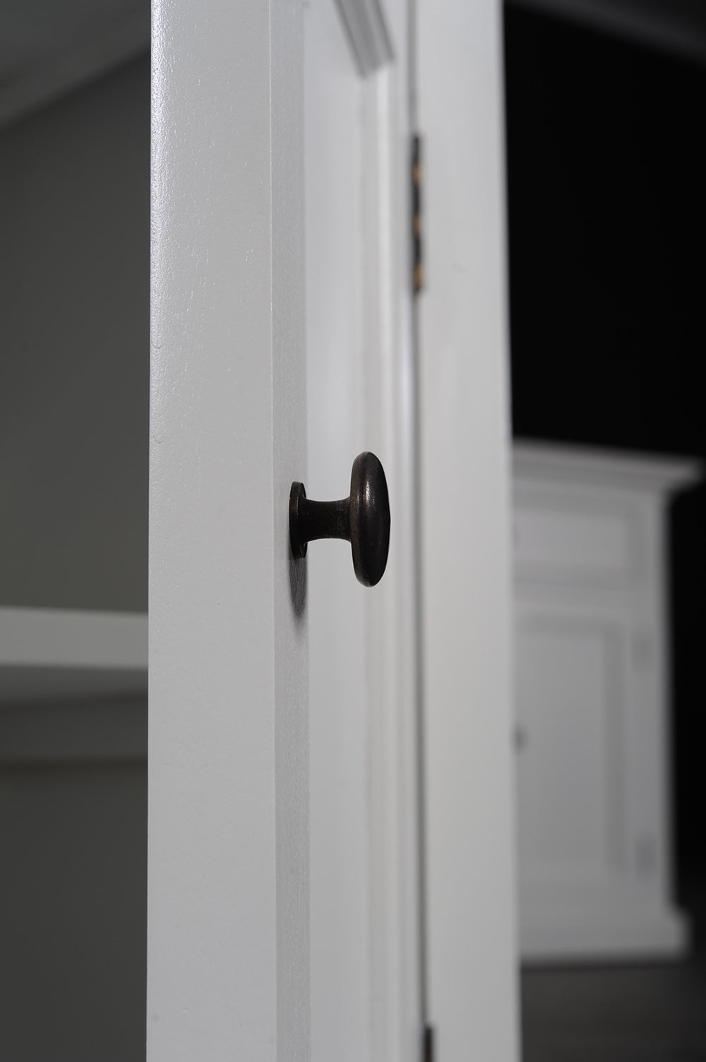 The generous proportions and farmhouse charm of this piece render it suitable for kitchen and living space. Crown moulding and shaker style doors offer subtle styling. Utensils or linens can easily be housed in the drawers while fixed shelving behind two sets of double doors provide ample storage.