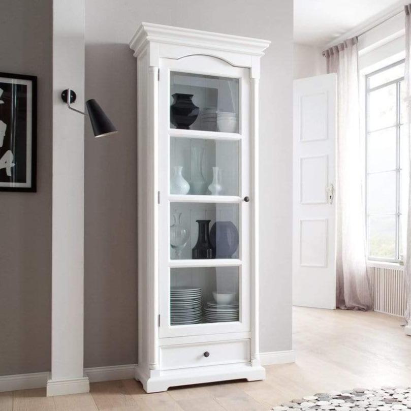 There are some designs that work in a multitude of ways but this glass cabinet looks its best when it’s used as intended – to display. With traditional features, from the cornice and side panels to the moulding that picture-frames the glass, it really is a piece inspired by the past. In a living area, store decorative accessories, photo frames and a mini book collection, or crockery, cups and glassware to create a slimline dresser in a kitchen. Style tip: introduce light behind closed doors by displaying a clear vase filled with a string of fairy lights and place it on one of the middle two shelves.