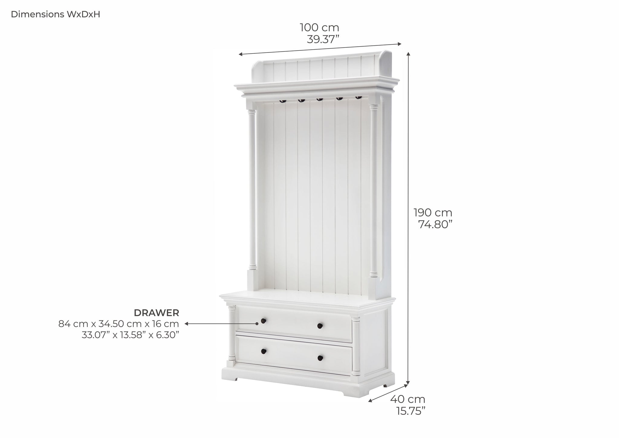 Keep entryway clutter at bay with this attractive bench and coat rack combo. A cleverly designed shelf, in place above the flared crown molding, tops the unit and offers an unexpected display opportunity. Antique brass hooks can accommodate a number of your guests’ coats or jackets with ease. A seating area is housed above two generous drawers. Attractive wainscoting forms a detailed backdrop to the unit, making this piece a visual treat when you step into your home.