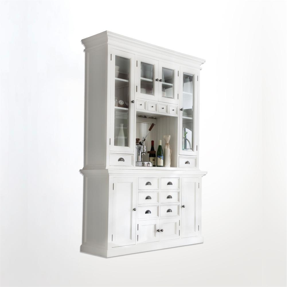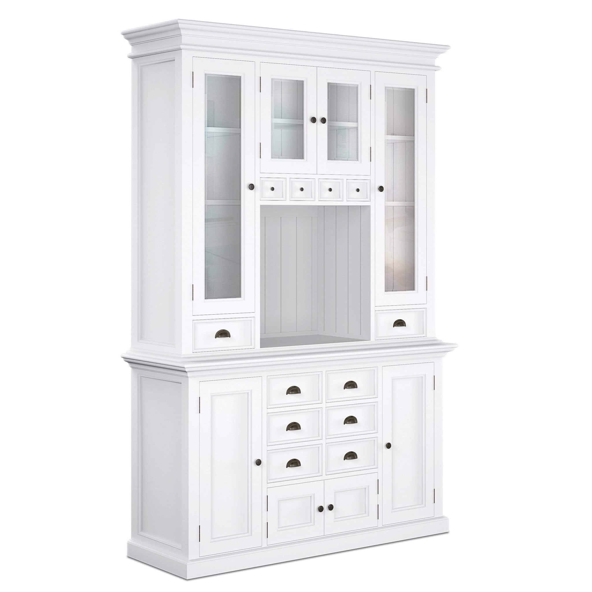 The perfect storage solution for your kitchen or dining room. Functionality is the key. Glass inserts in Shaker Style doors offer a glimpse at some of your favorite collectibles. The variation in drawer dimensions brilliantly accommodates any of your needs, small or large. The central recess, highlighted with attractive beadboard wainscotting, can function as a coffee or wine bar, or simply display some of your favorite cookbooks.