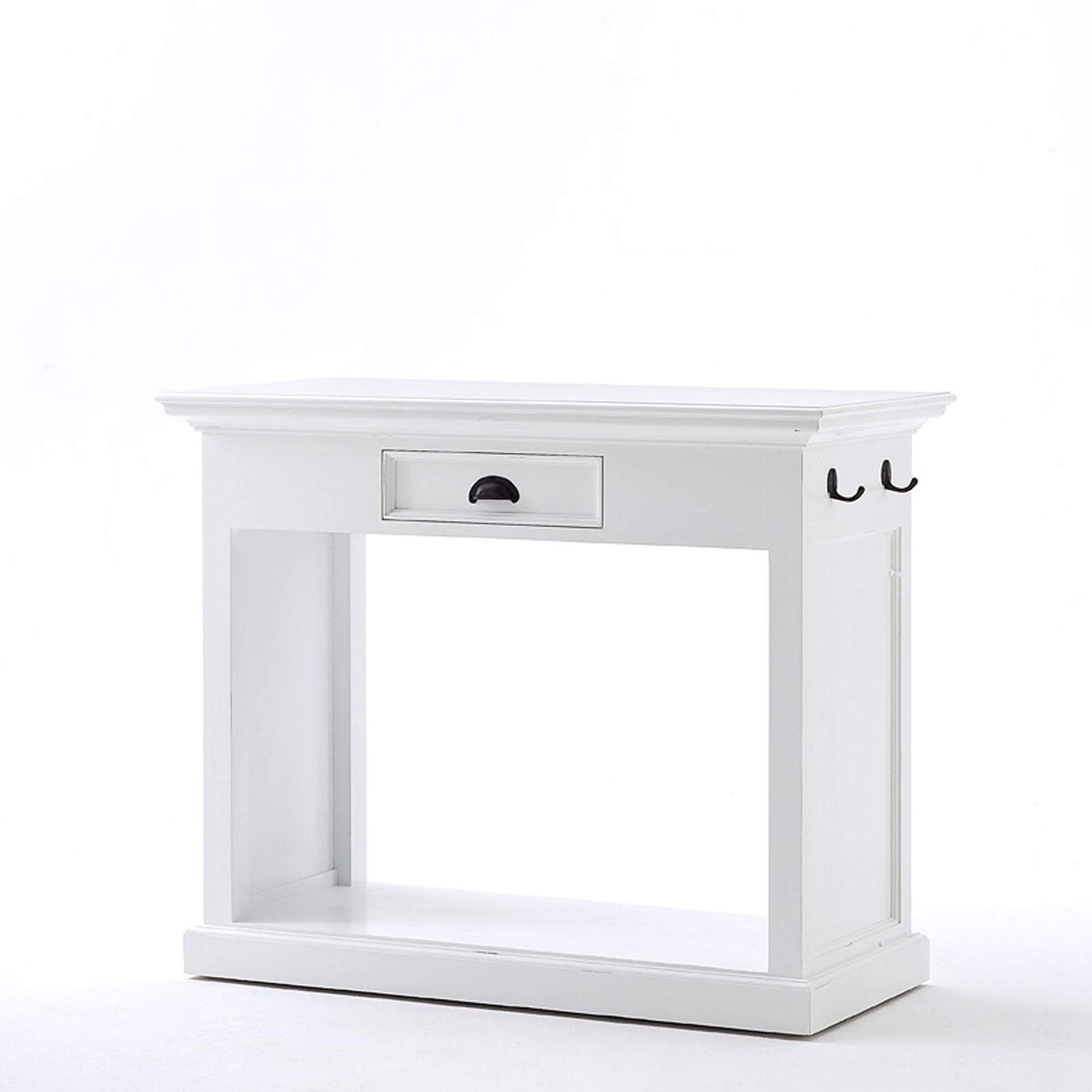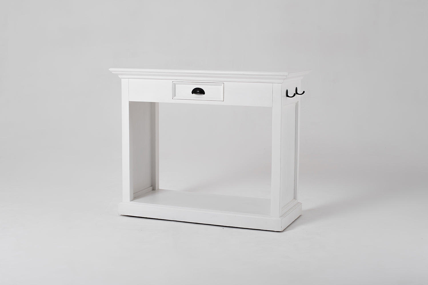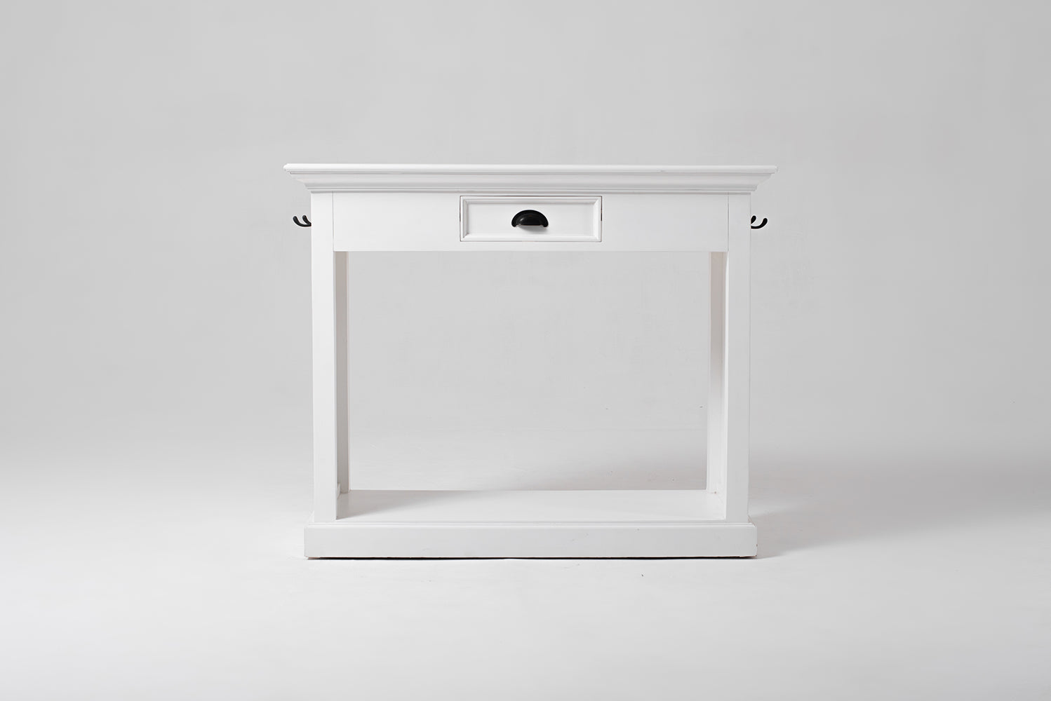 Small kitchen functionality at its best. This smart and compact dining unit is delivered in a charming, efficient package. Includes a drawer, 2 hooks, and storage space underneath. The two accompanying stools feature cushions fabricated in sturdy natural cotton with a herringbone weave. Cushion covers are removable for ease of cleaning. The semi-gloss painted finish and antique brass hardware completes the look.
