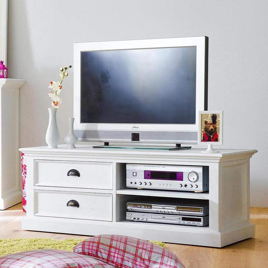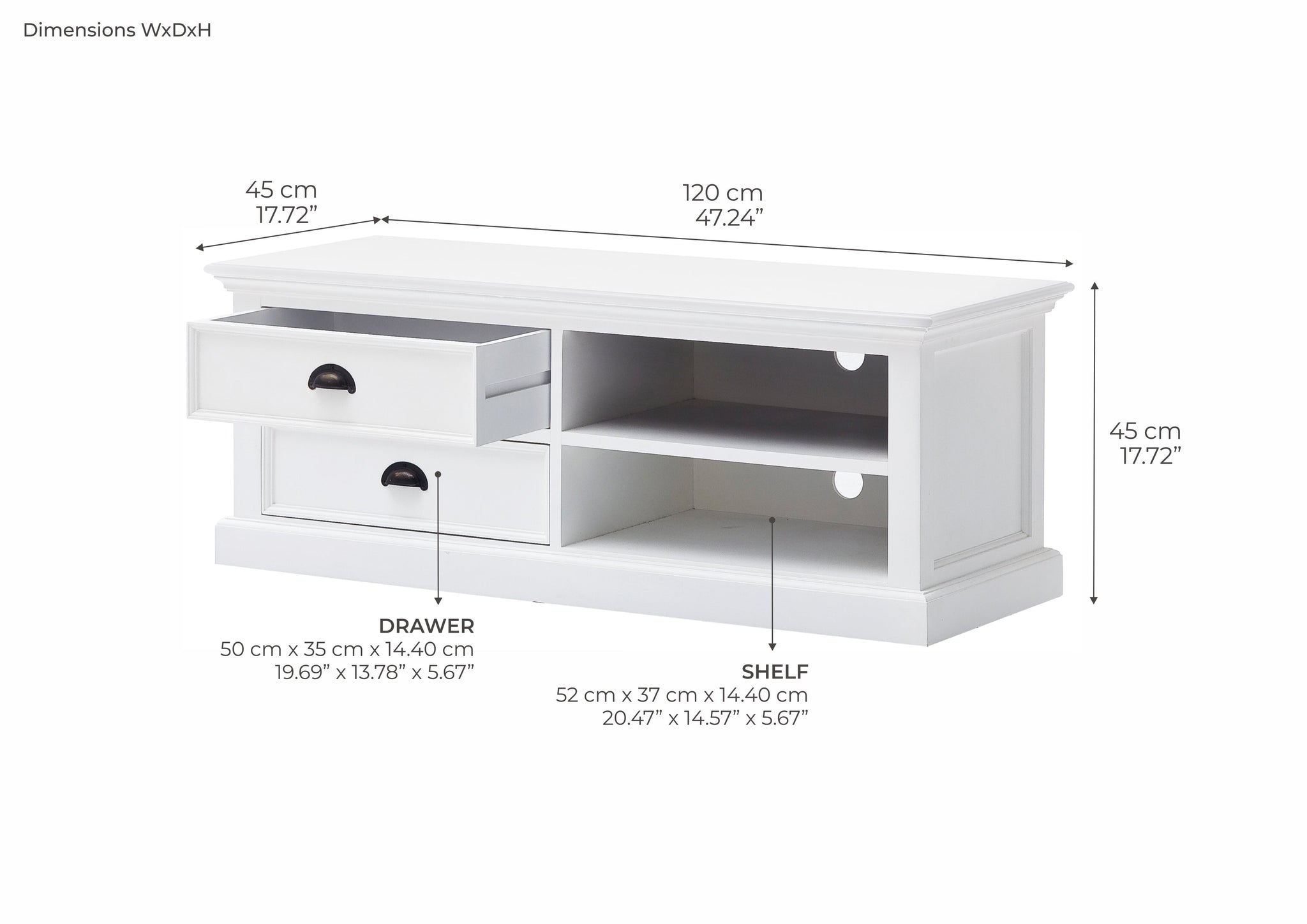 The low profile of this entertainment center offers the perfect platform for showcasing all your media components. Television viewing is at the perfect height and shelving provides ample allowance for additional electronic devices. Cord cutouts are in place for ease of connectability. Drawers can house smaller accessories and instruction manuals. The solid wood construction with detailed molding, is highlighted with a semigloss painted finish. Flared crown molding and detailed trim add simple elegance to the piece. Antique brass hardware completes the look.