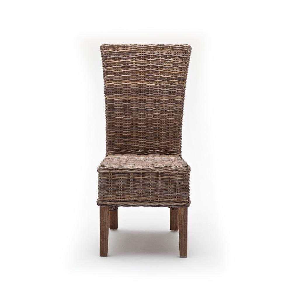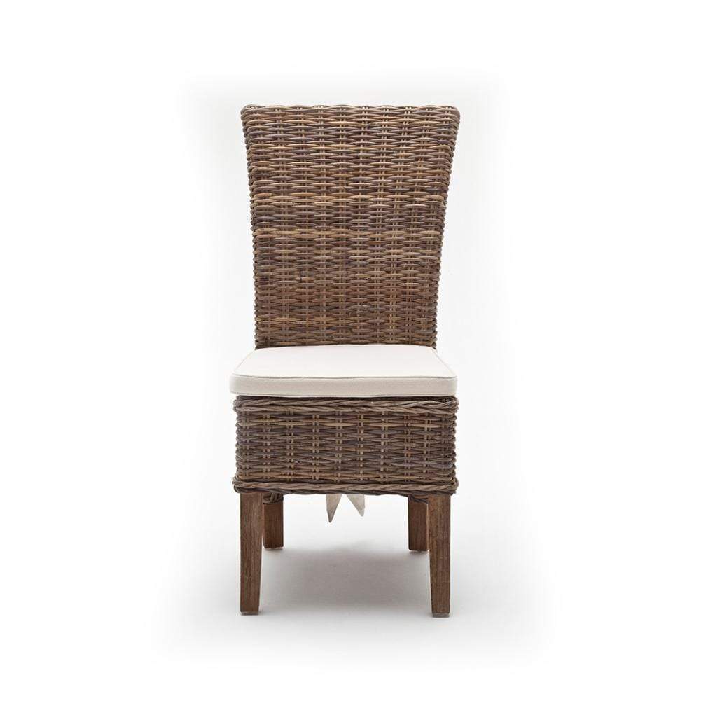 A casual yet chic dining chair realized in hand woven rattan encasing a solid mahogany curved frame. The dark natural tones contrast elegantly with the included seat cushion. Tie backs smartly keep the cushion in place but simultaneously add detail. Cleaning is a snap with the removable 100% cotton cover, fabricated in a sturdy herringbone. Sold in pairs.