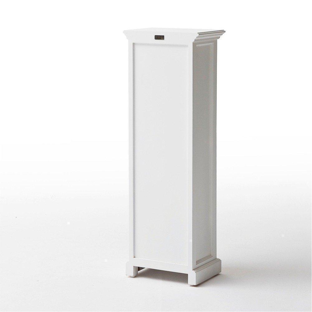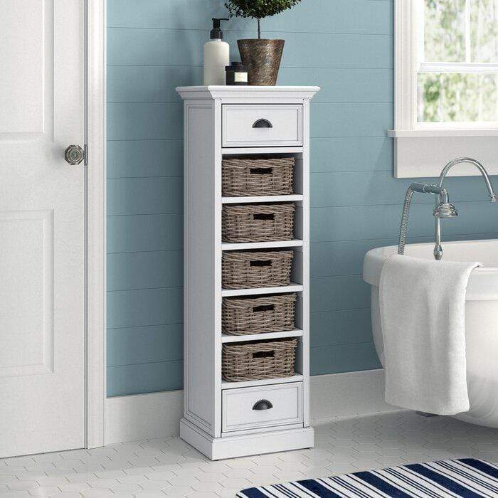 Cleverly designed tower storage units offer good looks and practicality in a charming package. Handwoven kubu rattan baskets, nestled on shelves, attractively counterpoint the drawers, and echo the look that the Halifax Collection is famous for. Flared molding and antique brass hardware complete the look.
