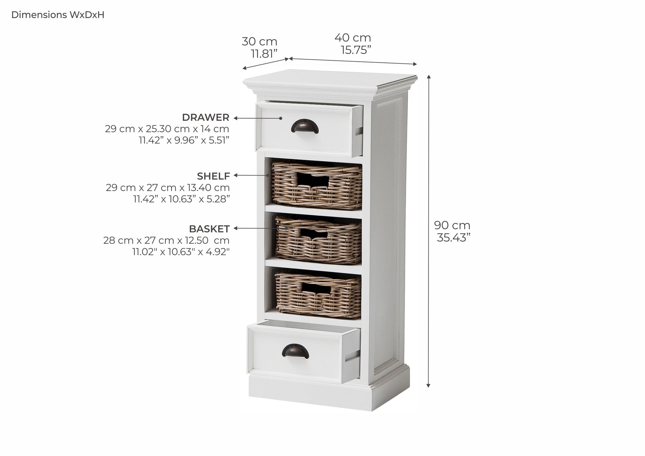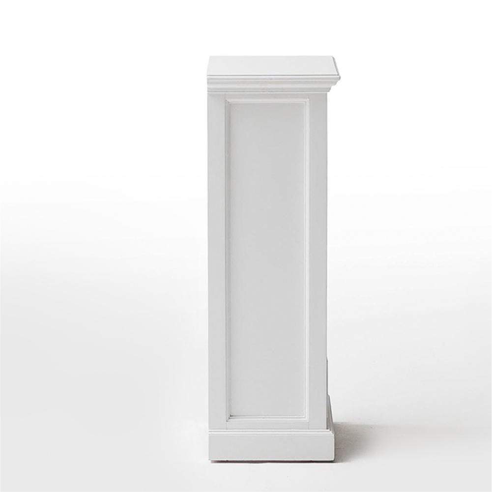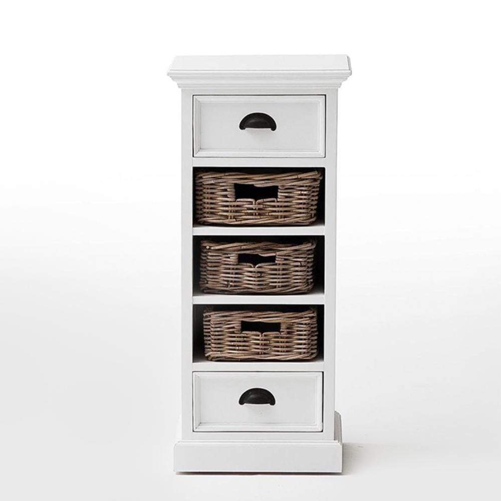 Cleverly designed tower storage units offer good looks and practicality in a charming package. Handwoven kubu rattan baskets, nestled on shelves, attractively counterpoint the drawers, and echo the look that the Halifax Collection is famous for. Flared molding and antique brass hardware completes the look.