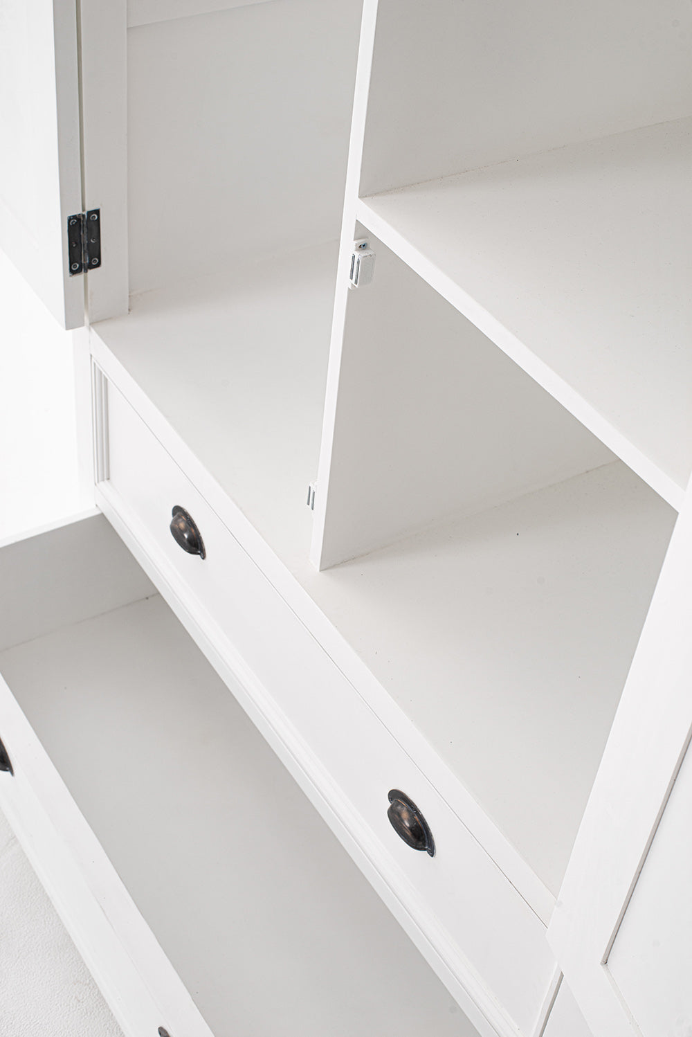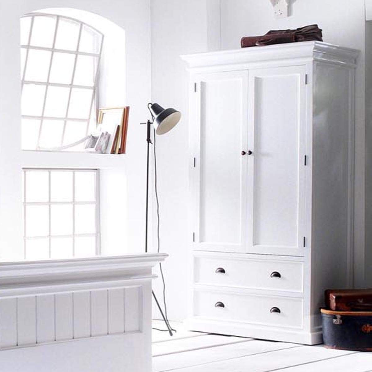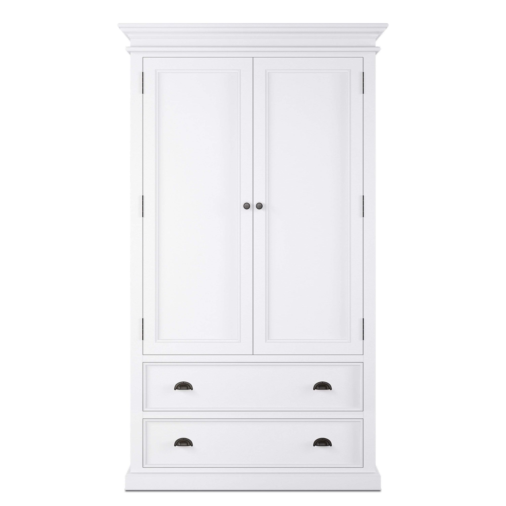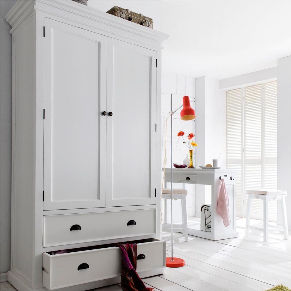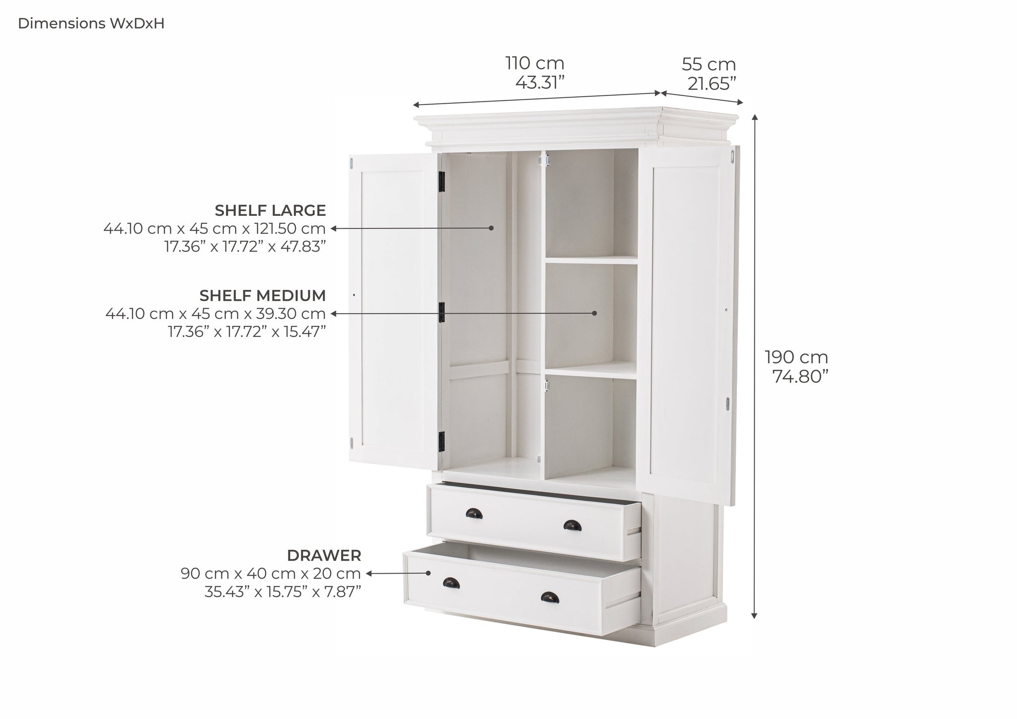 Handcrafted from kiln dried mahogany, this mid sized wardrobe offers extreme versatility, with the combination of shelves, drawers and hanging space. A place for everything! Crown molding and shaker style doors are further enhanced by the semigloss painted finish. All hardware comes with an antique brass finish.