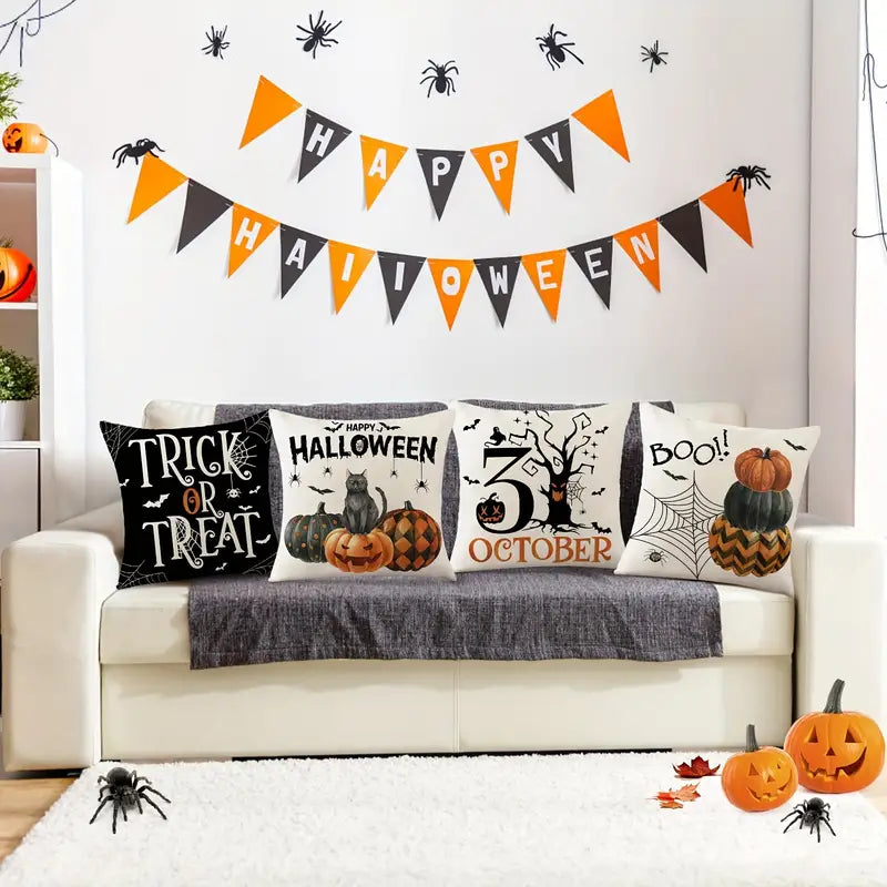 Description: Get ready for Halloween with our charming set of vintage-style pillow covers. This 4-pack features delightful designs that celebrate the spooky season, including pumpkins, playful cats, eerie spider webs, and fluttering bats. Each pillow cover is crafted from high-quality 100% linen, offering both durability and a touch of classic elegance to your decor.
