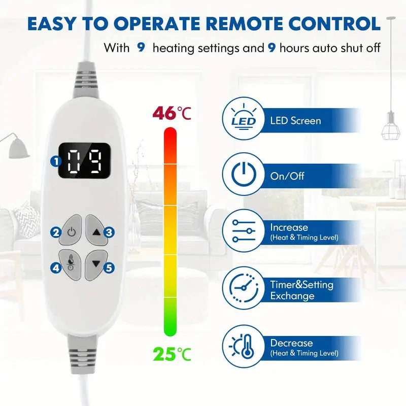 Equipped with an efficient PTC heater, our electric blanket heats up quickly and distributes warmth evenly, ensuring you stay comfortable throughout the night. The smart remote control with an LED display allows you to easily adjust between 9 different heat settings, catering to your personal preferences. Additionally, the 9-hour timer feature allows you to set the blanket to turn off automatically, promoting a safe and restful sleep.