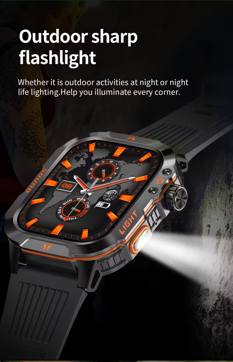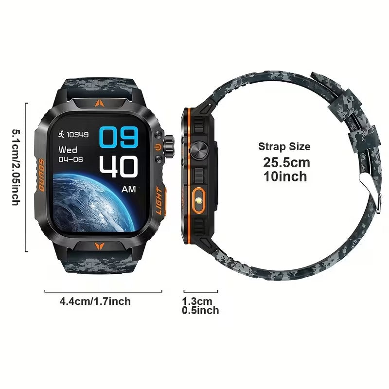 The NNETM Outdoor Smartwatch combines fitness tracking and outdoor navigation in one device. Equipped with a compass, altimeter, barometer, and LED flashlight, it helps you stay informed during any adventure. The smartwatch features wireless calling, fitness monitoring, and 100+ sports modes to keep you active and connected. Refer to the image for dimensions and design details. Compatible with both Android and iPhone, it’s perfect for tactical, sports, and everyday use.