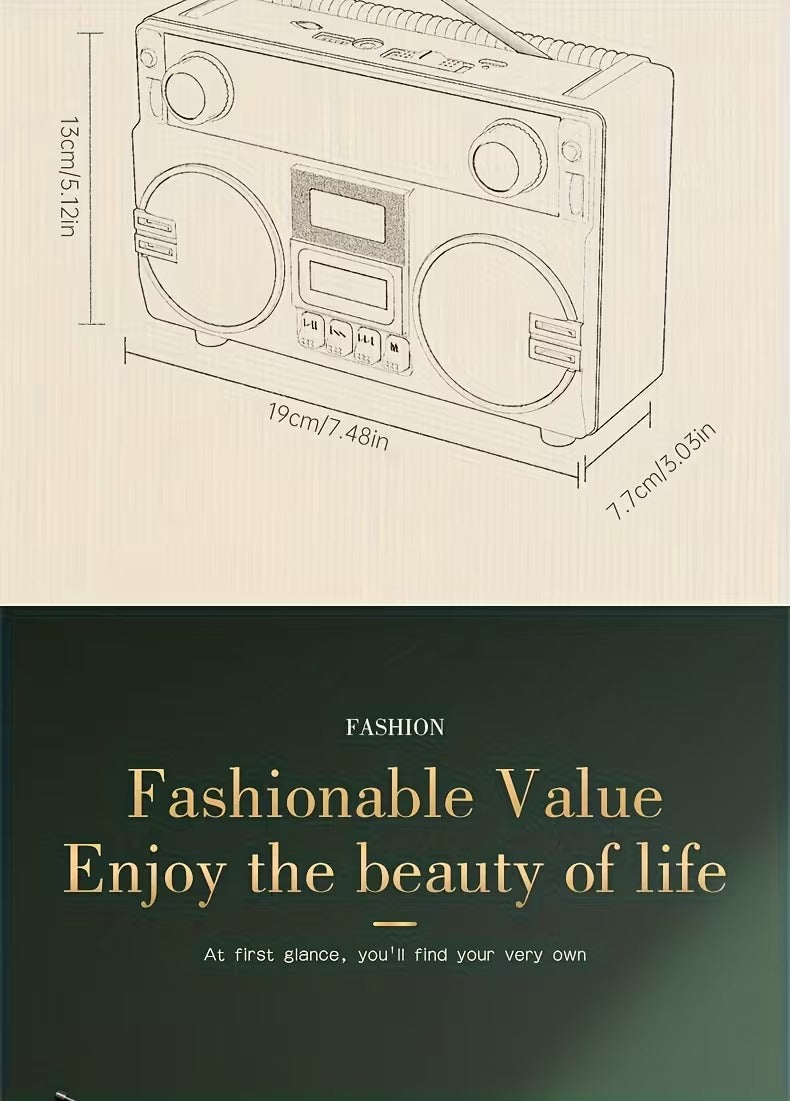 The NNETM Portable Multifunctional AM/FM/SW Radio keeps you entertained wherever life takes you. It features USB charging, TF card playback, and a multi-band radio for AM, FM, and SW frequencies, complete with an external antenna. Its compact size of 19 cm x 7.7 cm x 13 cm ensures portability without sacrificing performance. Refer to the image for precise dimensions. This versatile device is ideal for outdoor adventures, travel, or simply enjoying music at home.