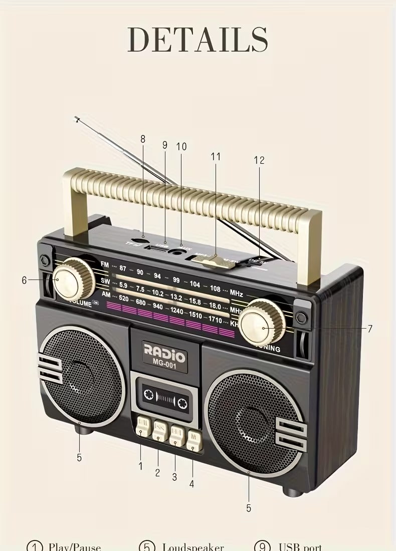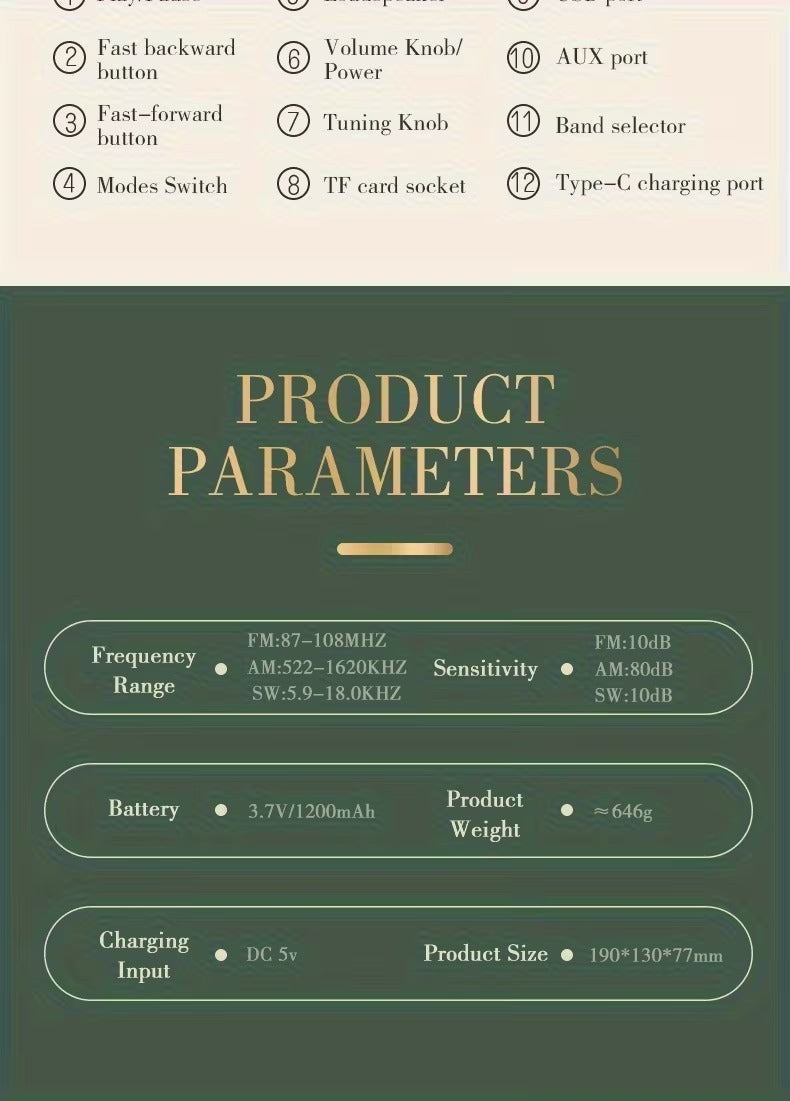 Functionality: AM/FM/SW multi-band, external antenna, TF card playback