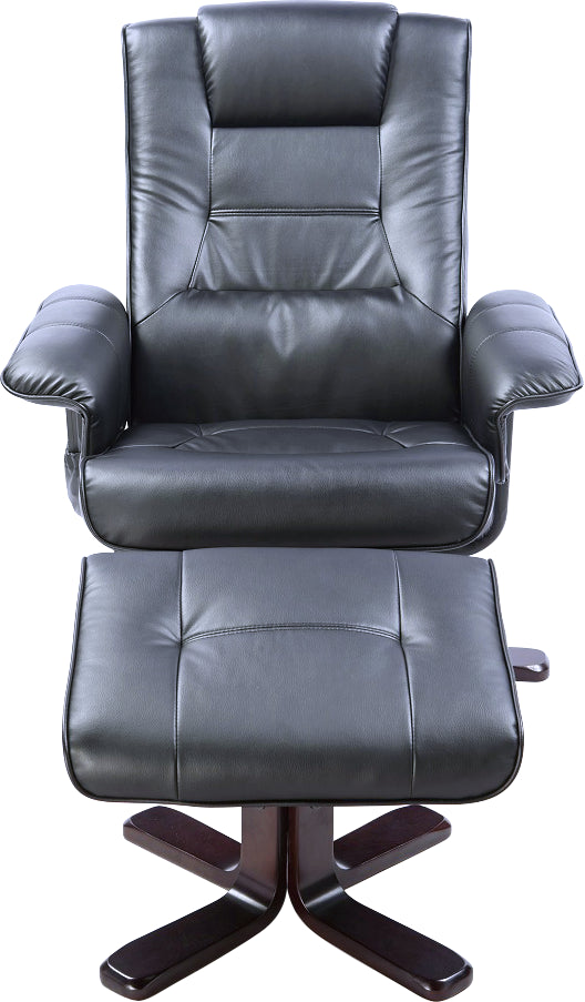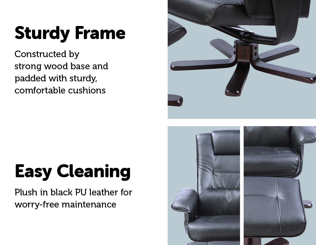 The massage recliner is made with comfortable PU Leather that's easy to clean. Classic black will go with any decór. The wooden base of both the recliner and the footrest are equally attractive and modern in a curved cappuccino-coloured wood.
