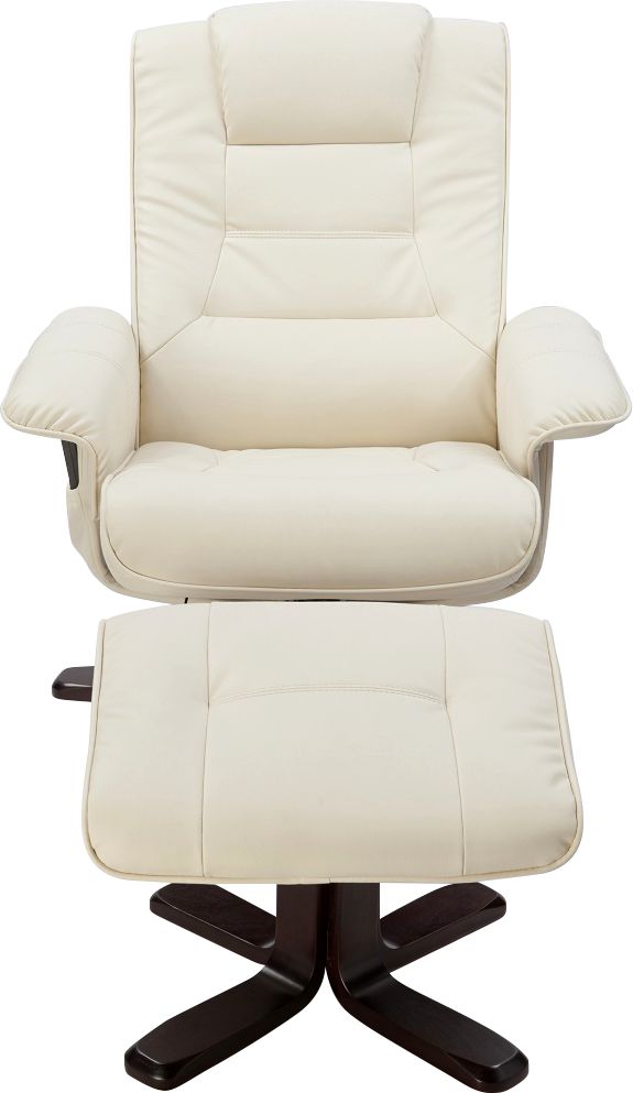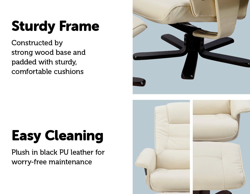 The massage recliner is made with comfortable PU Leather that's easy to clean. Classic cream will go with any decór. The wooden base of both the recliner and the footrest are equally attractive and modern in a curved cappuccino-coloured wood.