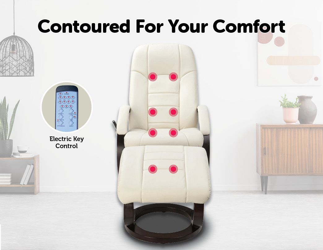 The deluxe massage recliner is made with comfortable PU Leather that's easy to clean. Classic cream will go with any decór. The wooden base of both the recliner and the footrest are equally attractive and modern in a curved cappuccino-coloured wood.