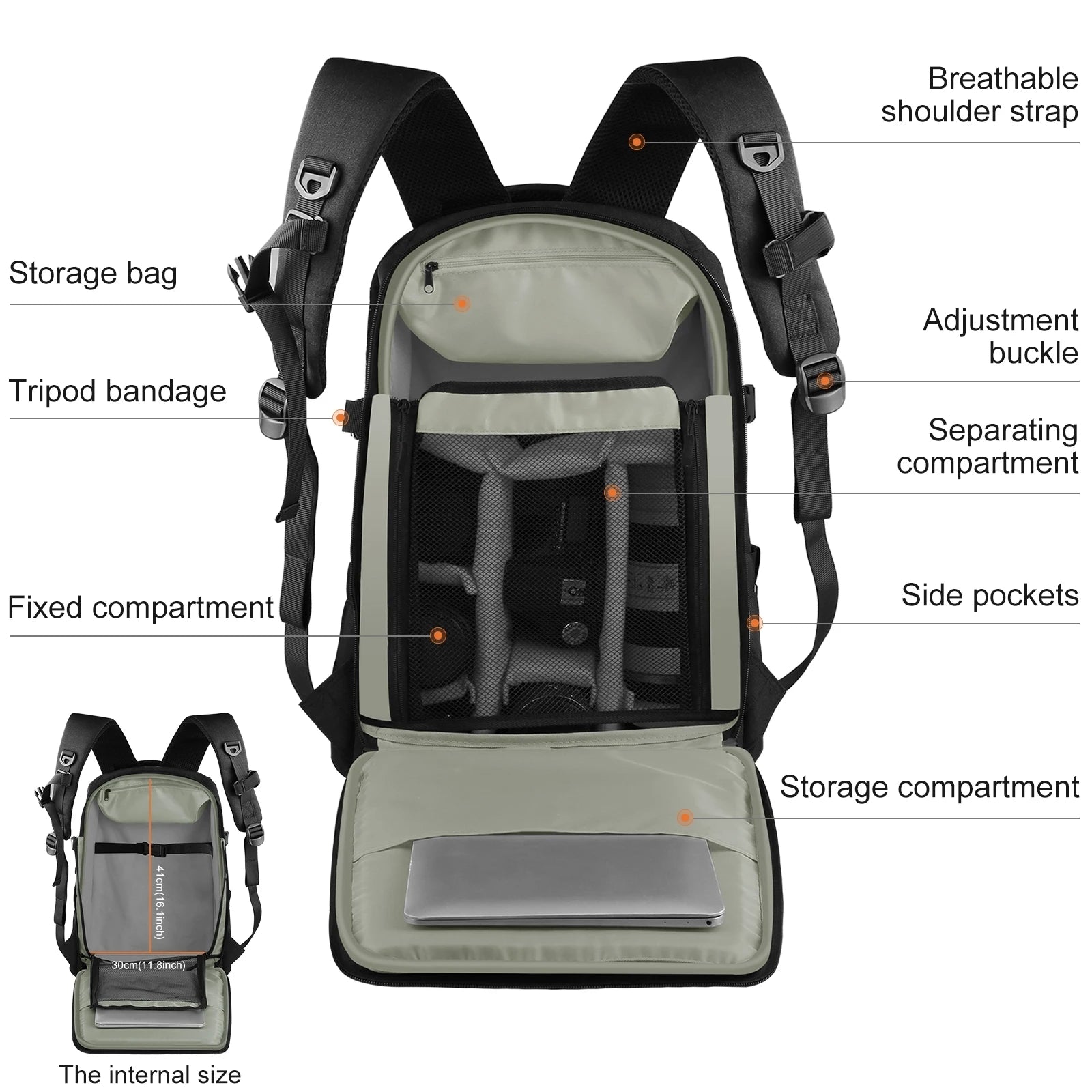Smart Organization: Dedicated slots for camera gear, laptop, tablet, water bottle, and personal accessories for efficient packing and quick access.