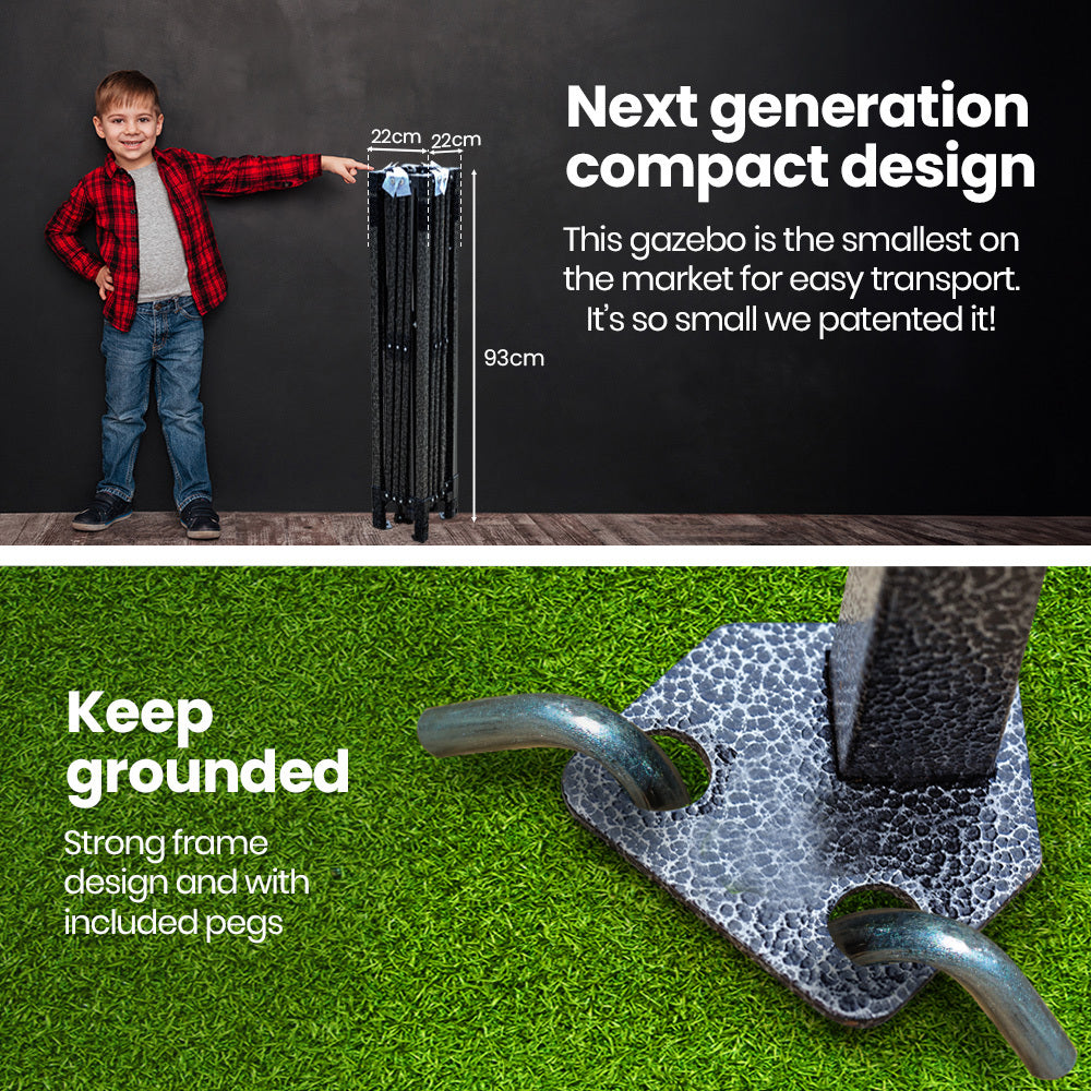The Red Track 3x3m Gazebo stands out with the smallest folded size on the market—just 93cm long! This ultra-compact 12kg design makes it incredibly easy for one person to carry, transport, and store, offering unmatched convenience compared to bulkier alternatives. Whether you're short on space or always on the move, this gazebo’s design ensures portability without compromise.