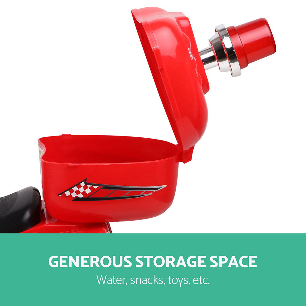 Triple-wheel design with quality anti-slip wheels, the ride on motorbike can move around on almost all surfaces safely. Simple operation with easy foot step control for the toddler to start the motorbike. Also features eye-catching flashing lights and openable rear storage box that will make your child?s imagination run wild.