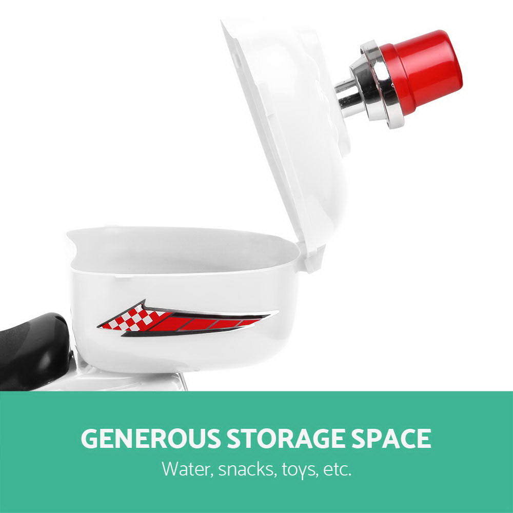 Triple-wheel design with quality anti-slip wheels, the ride on motorbike can move around on almost all surfaces safely. Simple operation with easy foot step control for the toddler to start the motorbike. Also features eye-catching flashing lights and openable rear storage box that will make your child?s imagination run wild.