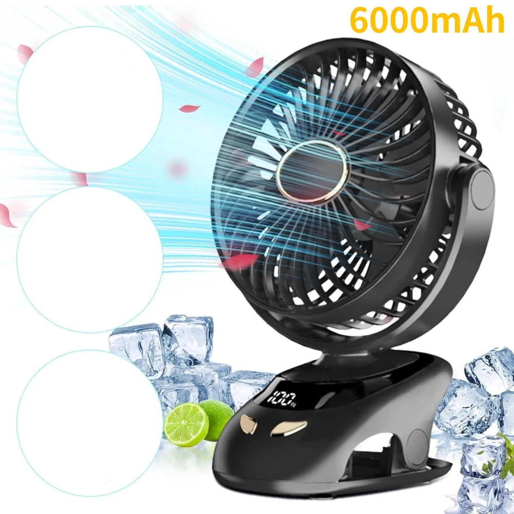 Stay refreshed wherever you go with this portable small desk clip-on fan. Its 6000mAh rechargeable battery provides cordless operation, while five adjustable speeds and a 90° rotating head let you customize airflow for your comfort. The LED display clearly shows wind speed and battery status for convenient monitoring.
