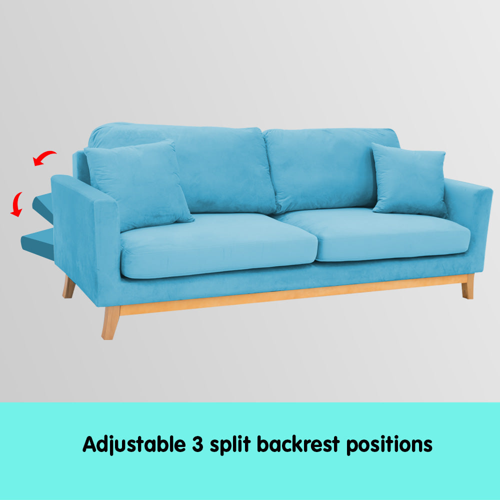 NNEDPE Sarantino 3 Seater Faux Velvet Wooden Sofa Bed Couch Furniture - Blue